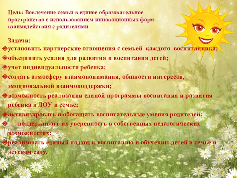 реализовать единый подход к воспитанию и обучению детей в семье и детском саду.
