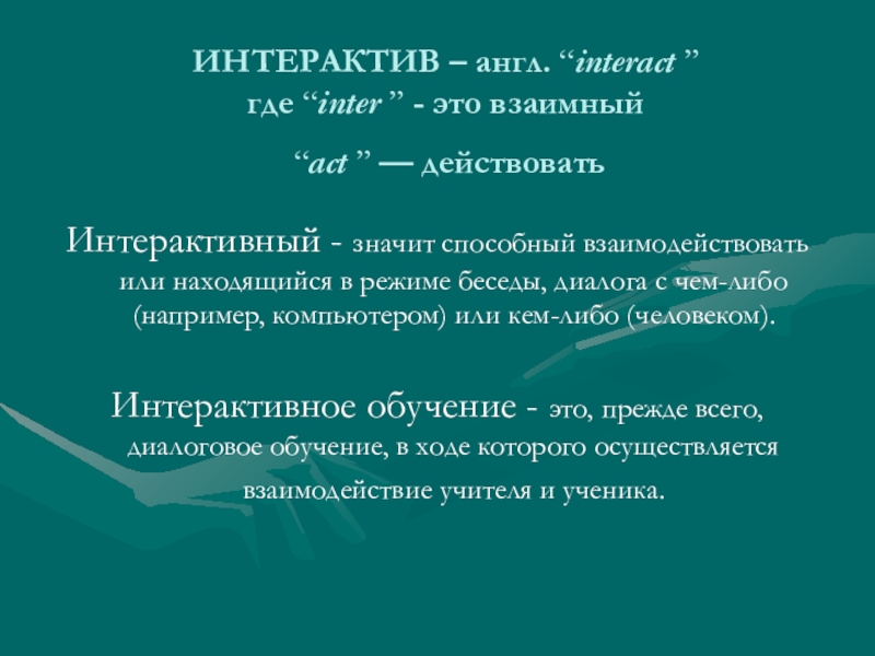 Интерактивный - значит способный взаимодействовать или находящийся в режиме беседы, диалога с чем-либо (например, компьютером) или кем-либо (человеком).
