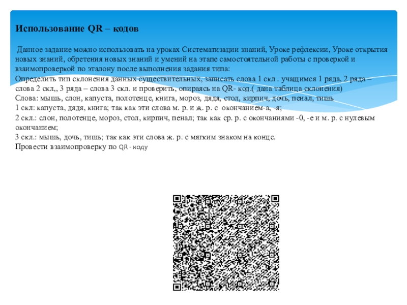 Определить тип склонения данных существительных, записать слова 1 скл . учащимся 1 ряда, 2 ряда – слова 2 скл,, 3 ряда – слова 3 скл. и проверить, опираясь на QR- код.( дана таблица склонения)