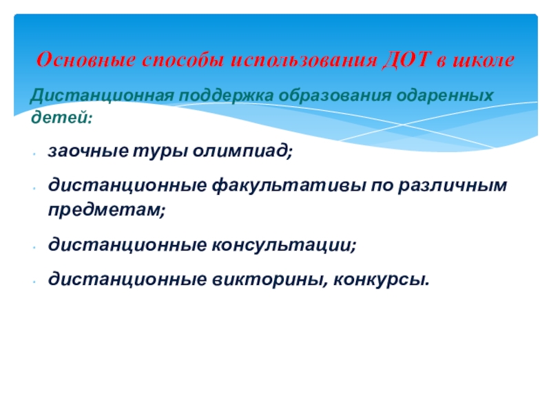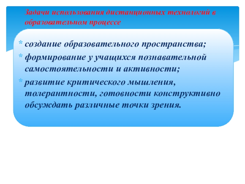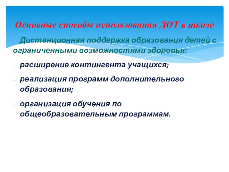 Решить проблемы обеспечения равных возможностей для получения качественного общего образования, весомо дополнить и расширить традиционные формы организации общего образования позволит широкое использование обучения с использованием дистанционных образовательных технологий.