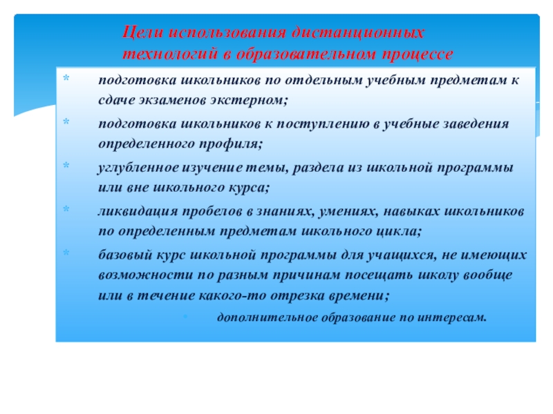 Слайд 19подготовка школьников по отдельным учебным предметам к сдаче экзаменов экстерном;