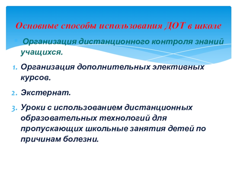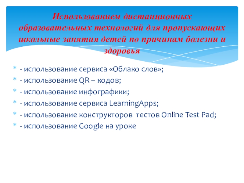 Использованием дистанционных образовательных технологий для пропускающих школьные занятия детей по причинам болезни и здоровья