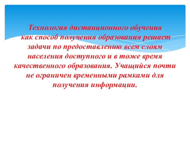 всем слоям населения доступного и в тоже время качественного образования. Учащийся почти не ограничен временными рамками для получения информации.