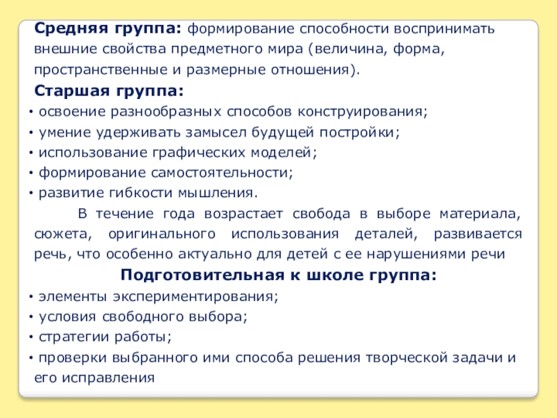 В течение года возрастает свобода в выборе материала, сюжета, оригинального использования деталей, развивается речь, что особенно актуально для детей с ее нарушениями речи