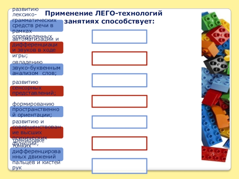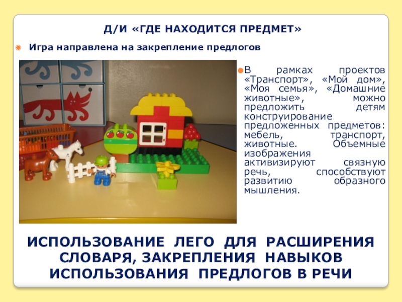 Слайд 33ИСПОЛЬЗОВАНИЕ ЛЕГО ДЛЯ РАСШИРЕНИЯ СЛОВАРЯ, ЗАКРЕПЛЕНИЯ НАВЫКОВ ИСПОЛЬЗОВАНИЯ ПРЕДЛОГОВ В РЕЧИ
