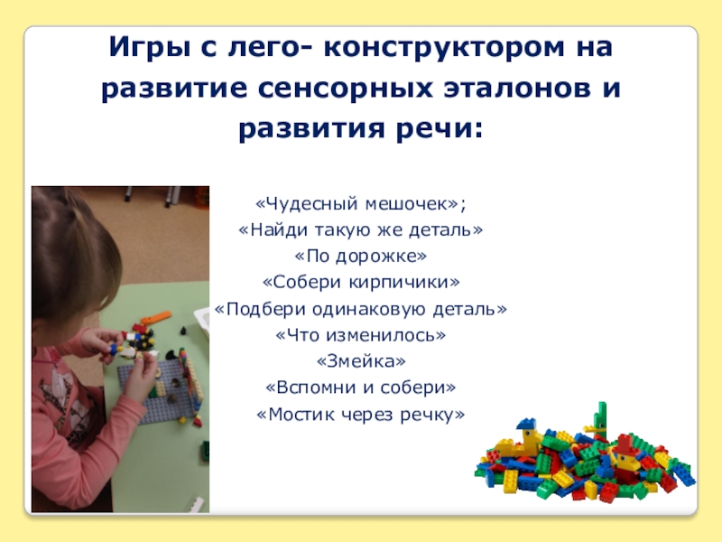 Слайд 27Игры с лего- конструктором на развитие сенсорных эталонов и развития речи: