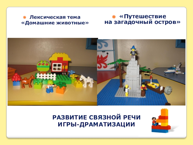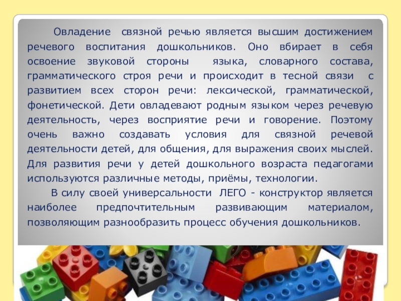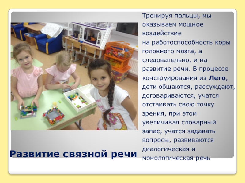 и на развитие речи. В процессе конструирования из Лего, дети общаются, рассуждают,