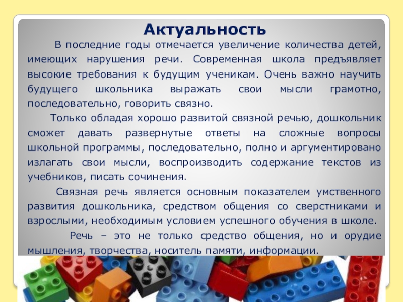нарушения речи. Современная школа предъявляет высокие требования к будущим ученикам. Очень важно научить будущего школьника выражать свои мысли грамотно, последовательно, говорить связно.