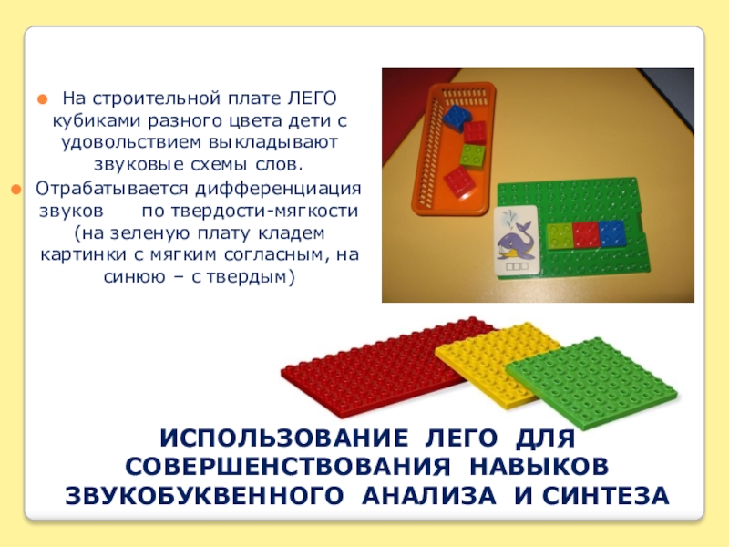 Слайд 31ИСПОЛЬЗОВАНИЕ ЛЕГО ДЛЯ СОВЕРШЕНСТВОВАНИЯ НАВЫКОВ ЗВУКОБУКВЕННОГО АНАЛИЗА И СИНТЕЗА