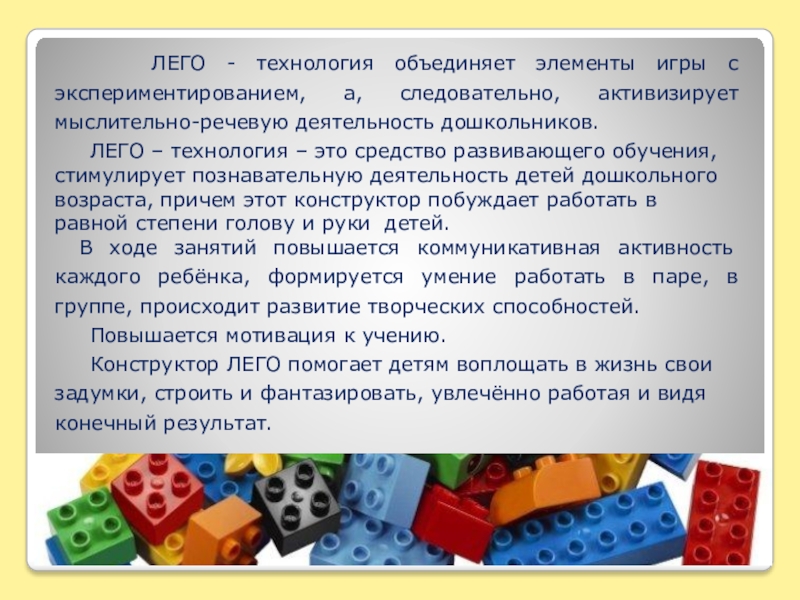 ЛЕГО – технология – это средство развивающего обучения, стимулирует познавательную деятельность детей дошкольного возраста, причем этот конструктор побуждает работать в равной степени голову и руки детей.