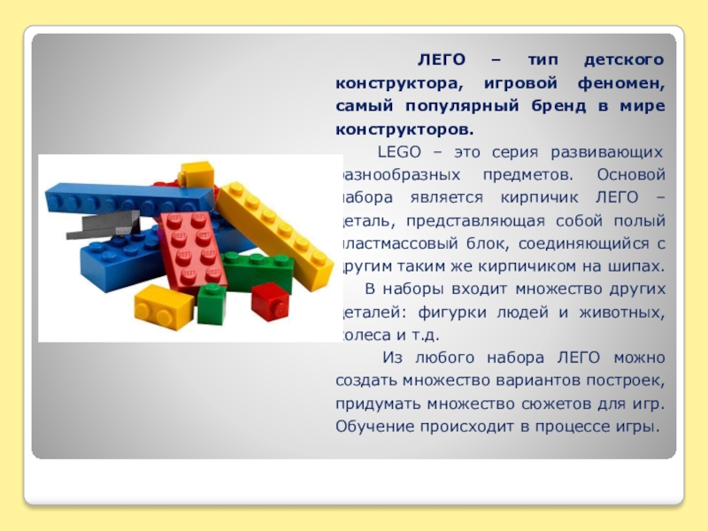 Слайд 6 ЛЕГО – тип детского конструктора, игровой феномен, самый популярный