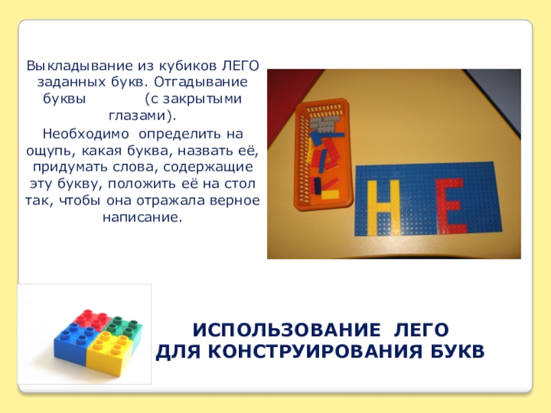 Выкладывание из кубиков ЛЕГО заданных букв. Отгадывание буквы (с закрытыми глазами).