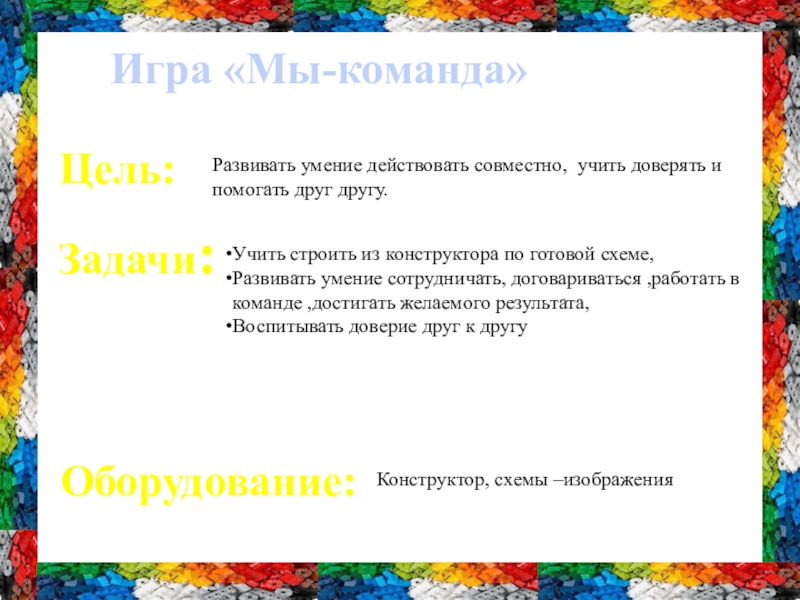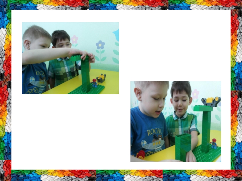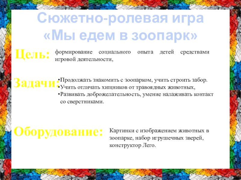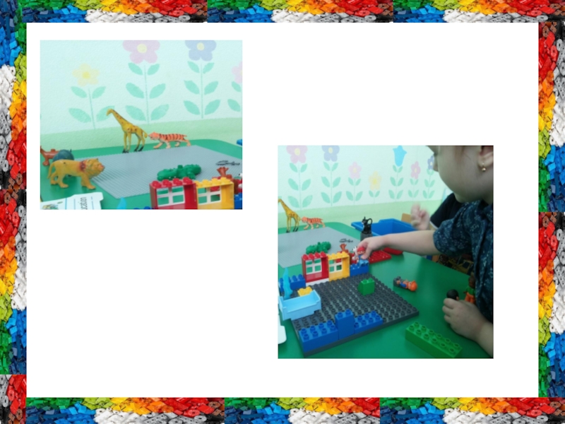 Задачи: расширить представления о животных; формировать у детей творчески развивать сюжет используя Лего конструктор, разнообразно действовать с ним; воспитывать дружеское отношение между детьми.
