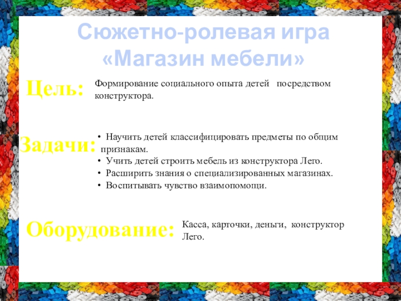 Развитие у детей интереса к сюжетно-ролевой игре, помочь создать игровую обстановку посредством конструктора.