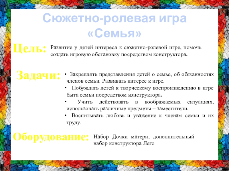 Побуждать детей к творческому воспроизведению в игре быта семьи посредством конструктора.