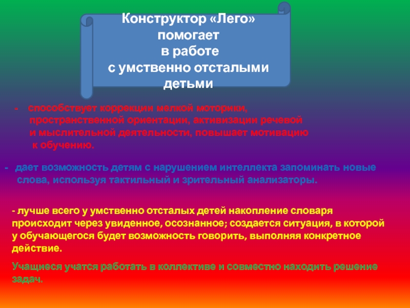 - лучше всего у умственно отсталых детей накопление словаря происходит через увиденное, осознанное; создается ситуация, в которой у обучающегося будет возможность говорить, выполняя конкретное действие.
