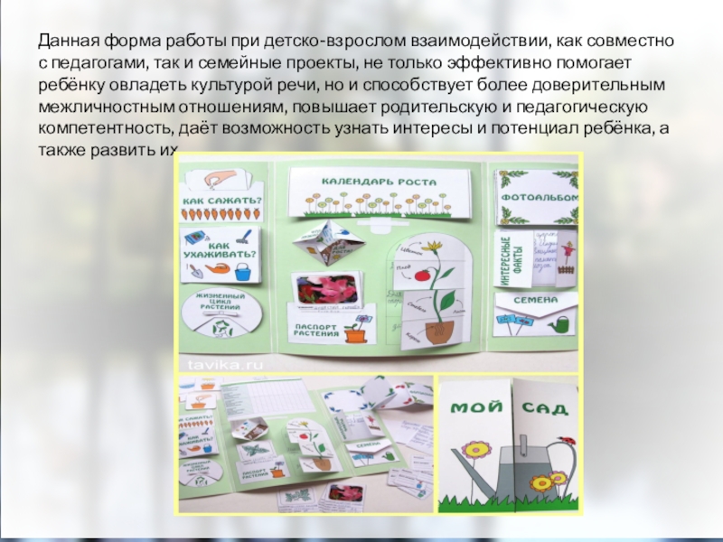 и семейные проекты, не только эффективно помогает ребёнку овладеть культурой речи, но и способствует более доверительным межличностным отношениям, повышает родительскую и педагогическую компетентность, даёт возможность узнать интересы и потенциал ребёнка, а также развить их.