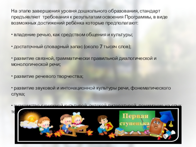 Слайд 3На этапе завершения уровня дошкольного образования, стандарт предъявляет требования к результатам