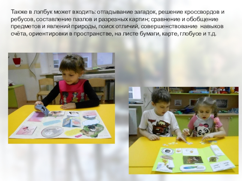 Слайд 10Также в лэпбук может входить: отгадывание загадок, решение кроссвордов и ребусов,