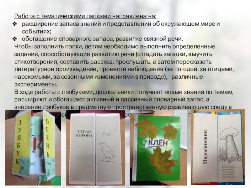 В ходе работы с лэпбуками, дошкольники получают новые знания по темам, расширяют и обогащают активный и пассивный словарный запас, а внесение лэпбуков в предметную пространственную развивающую среду в группах, в дальнейшем позволит быстро освежить в памяти пройденные темы.
