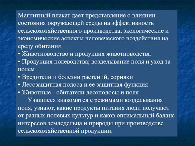 сельскохозяйственного производства, экологические и экономические аспекты человеческого воздействия на среду обитания.