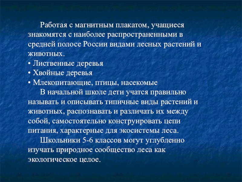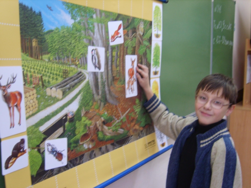 В начальной школе дети учатся правильно называть и описывать типичные виды растений и животных, распознавать и различать их между собой, самостоятельно конструировать цепи питания, характерные для экосистемы леса.
