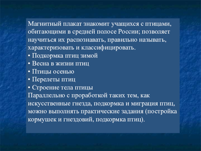 Слайд 24Магнитный плакат знакомит учащихся с птицами, обитающими в средней полосе России;