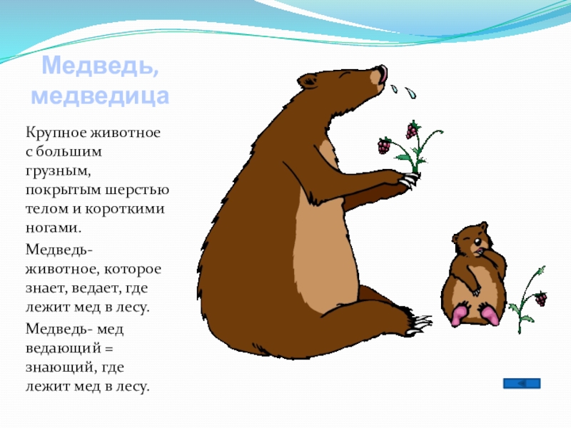Медведь- животное, которое знает, ведает, где лежит мед в лесу.