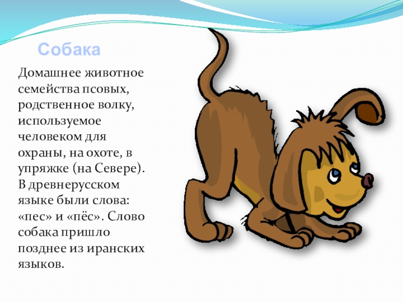 охоте, в упряжке (на Севере). В древнерусском языке были слова: «пес» и «пёс». Слово собака пришло позднее из иранских языков.