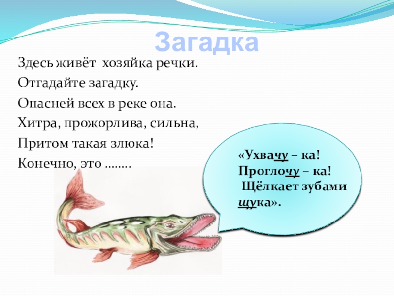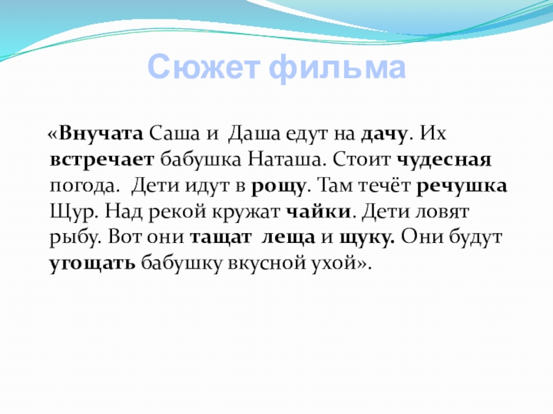 Их встречает бабушка Наташа. Стоит чудесная погода. Дети идут в рощу. Там течёт речушка Щур. Над рекой кружат чайки. Дети ловят рыбу. Вот они тащат леща и щуку. Они будут угощать бабушку вкусной ухой».