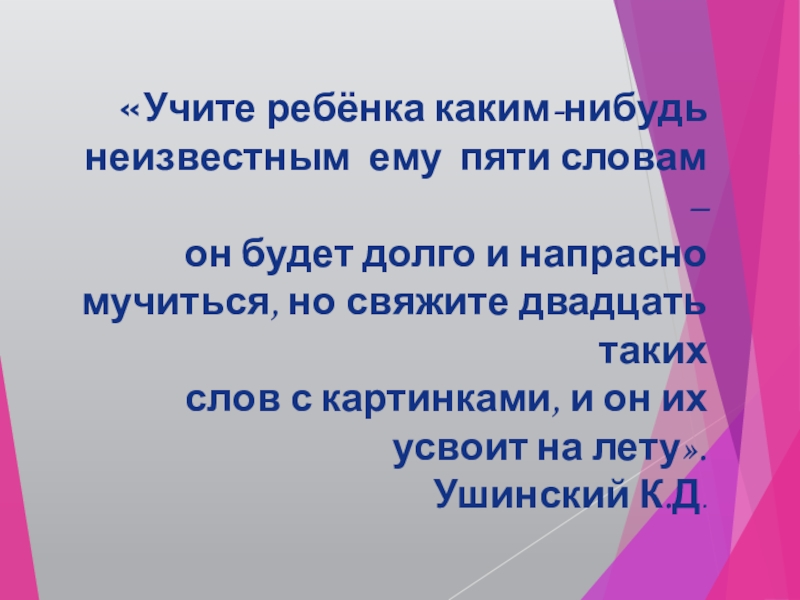 «Учите ребёнка каким-нибудь неизвестным ему пяти словам – он будет долго и напрасно мучиться, но свяжите двадцать таких слов с картинками, и он их усвоит на лету». Ушинский К.Д.