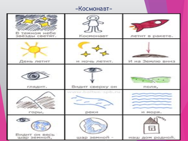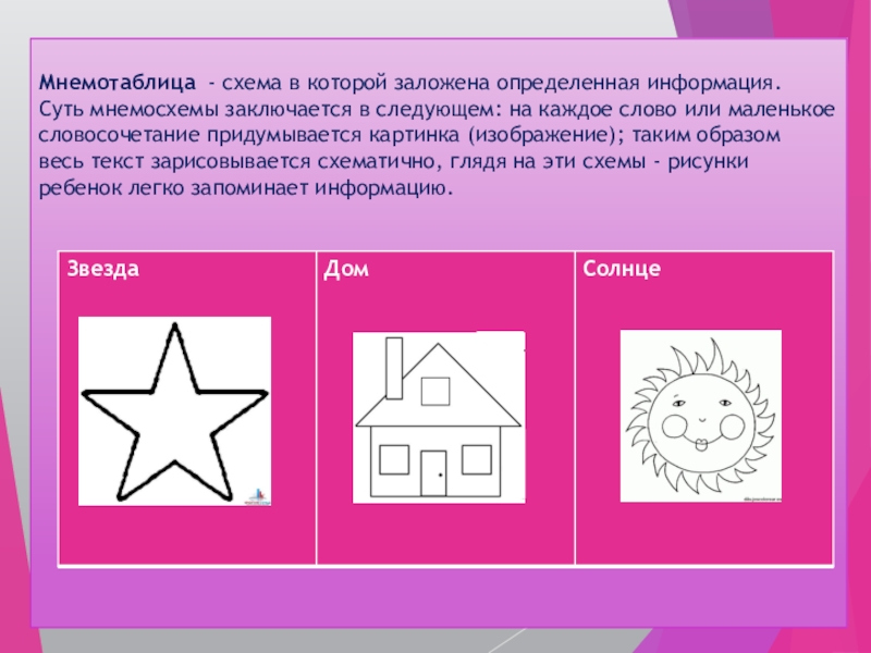 Мнемотаблица - схема в которой заложена определенная информация. Суть мнемосхемы заключается в следующем: на каждое слово или