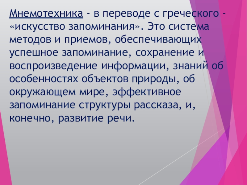 Мнемотехника - в переводе с греческого - «искусство запоминания». Это система методов и приемов, обеспечивающих успешное запоминание,