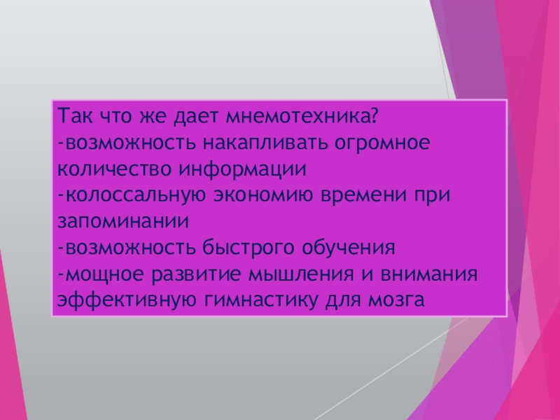 Так что же дает мнемотехника?-возможность накапливать огромное количество информации-колоссальную экономию времени при запоминании-возможность быстрого обучения-мощное развитие