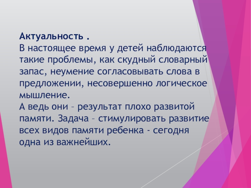 Актуальность .В настоящее время у детей наблюдаются такие проблемы, как скудный словарный запас, неумение согласовывать слова в