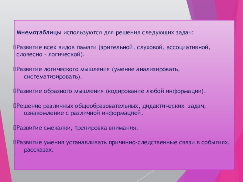 Мнемотаблицы используются для решения следующих задач:Развитие всех видов памяти (зрительной, слуховой, ассоциативной, словесно – логической).Развитие логического мышления