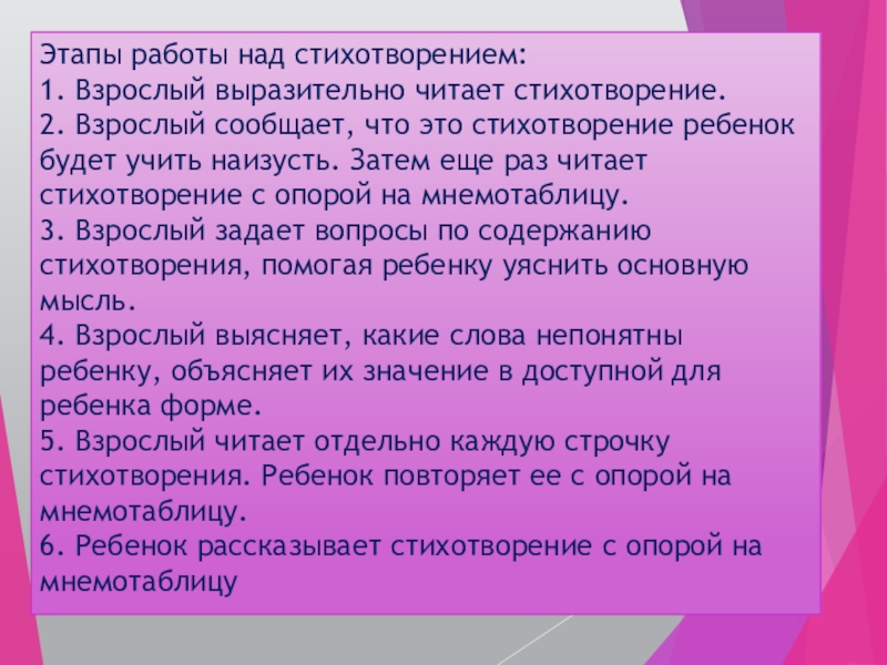 Этапы работы над стихотворением:1. Взрослый выразительно читает стихотворение. 2. Взрослый сообщает, что это стихотворение ребенок будет учить