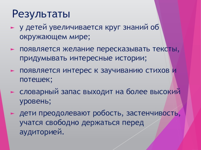 Результатыу детей увеличивается круг знаний об окружающем мире; появляется желание пересказывать тексты, придумывать интересные истории; появляется интерес
