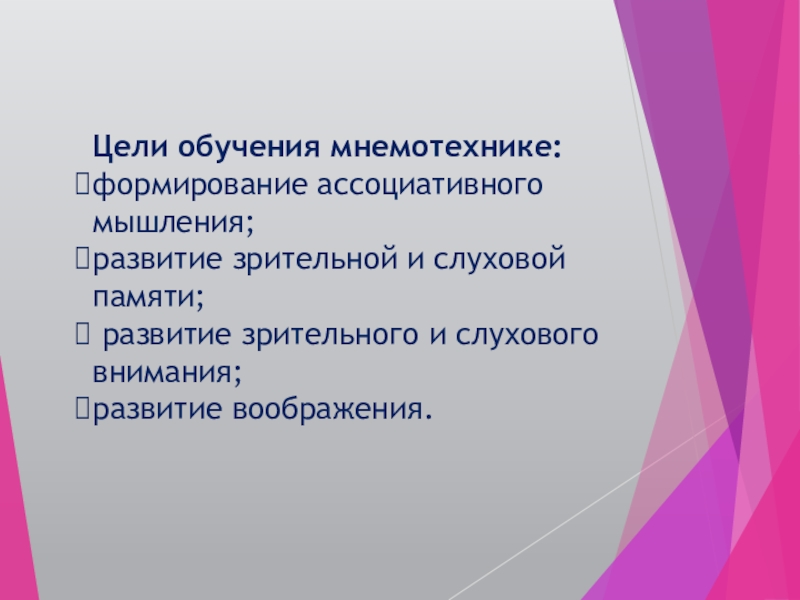 Цели обучения мнемотехнике: формирование ассоциативного мышления; развитие зрительной и слуховой памяти; развитие зрительного и слухового внимания; развитие воображения.