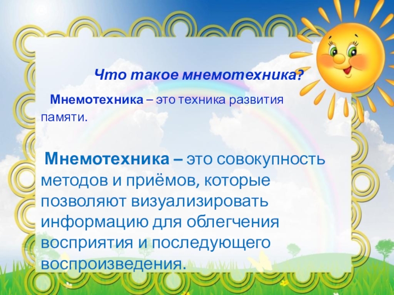 Мнемотехника – это совокупность методов и приёмов, которые позволяют визуализировать информацию для облегчения восприятия и последующего воспроизведения.