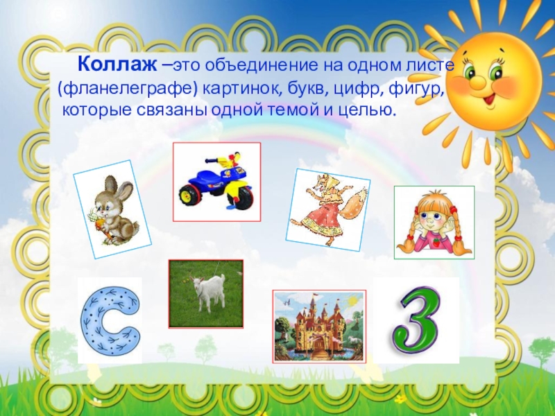 Слайд 39 Коллаж –это объединение на одном листе (фланелеграфе) картинок, букв,