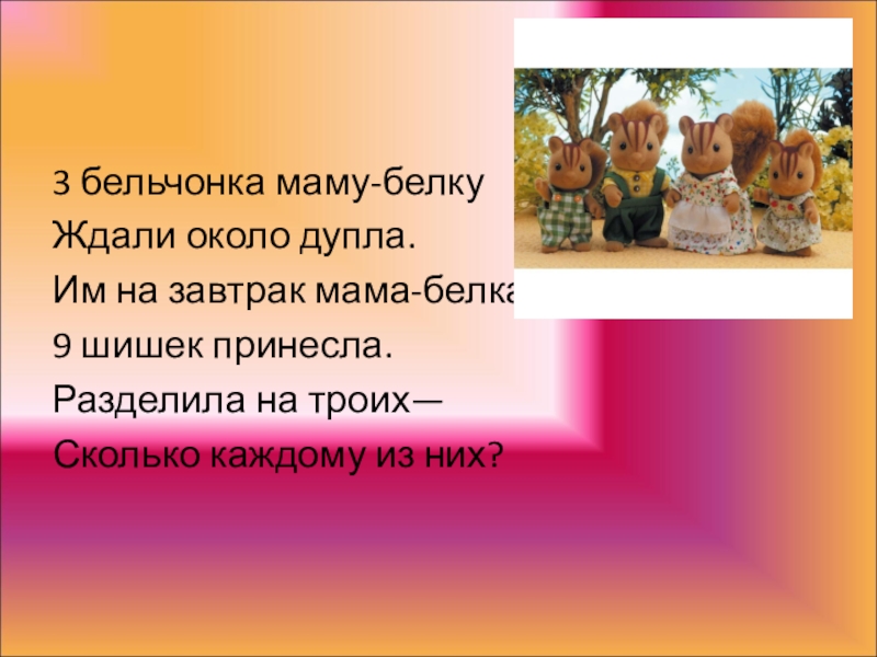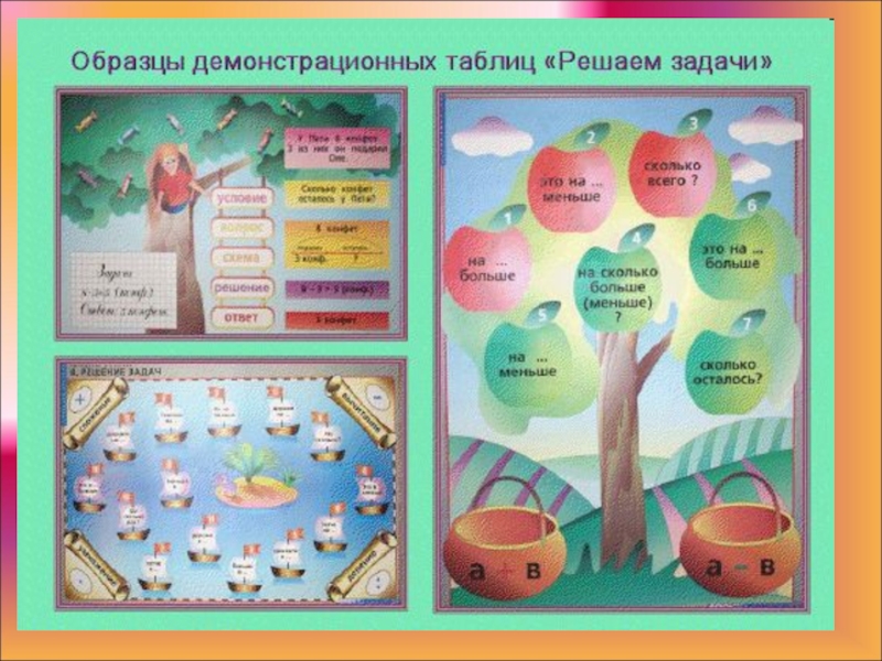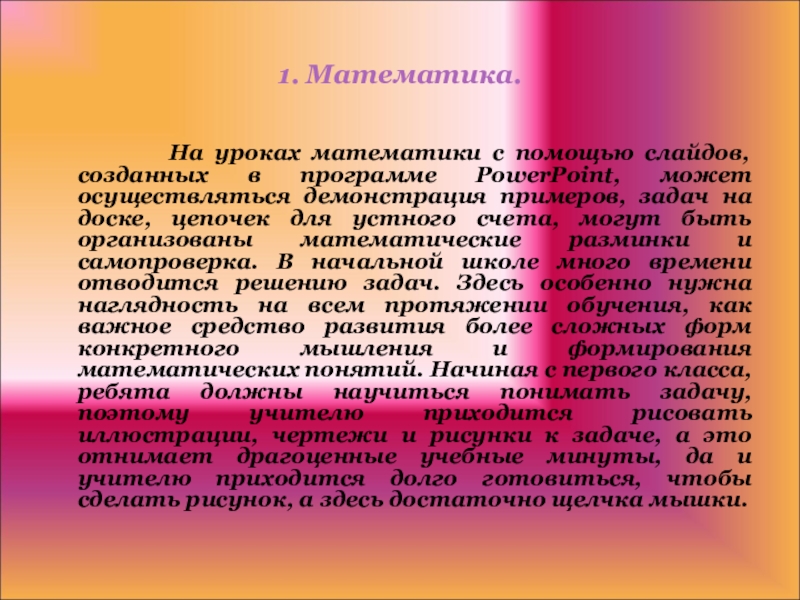 помощью слайдов, созданных в программе PowerPoint, может осуществляться демонстрация примеров, задач на доске, цепочек для устного счета, могут быть организованы математические разминки и самопроверка. В начальной школе много времени отводится решению задач. Здесь особенно нужна наглядность на всем протяжении обучения, как важное средство развития более сложных форм конкретного мышления и формирования математических понятий. Начиная с первого класса, ребята должны научиться понимать задачу, поэтому учителю приходится рисовать иллюстрации, чертежи и рисунки к задаче, а это отнимает драгоценные учебные минуты, да и учителю приходится долго готовиться, чтобы сделать рисунок, а здесь достаточно щелчка мышки.