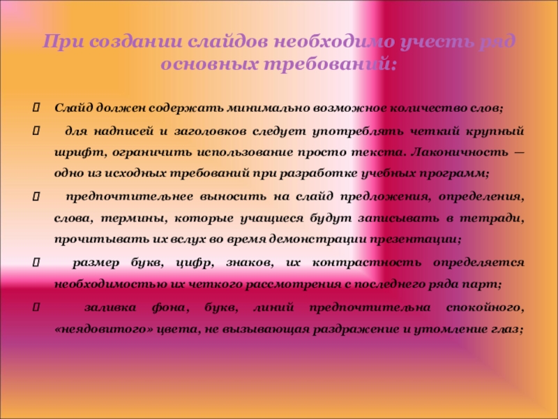 Слайд 36При создании слайдов необходимо учесть ряд основных требований: