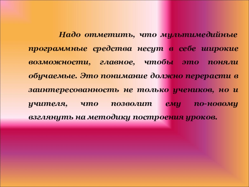 средства несут в себе широкие возможности, главное, чтобы это поняли обучаемые. Это понимание должно перерасти в заинтересованность не только учеников, но и учителя, что позволит ему по-новому взглянуть на методику построения уроков.