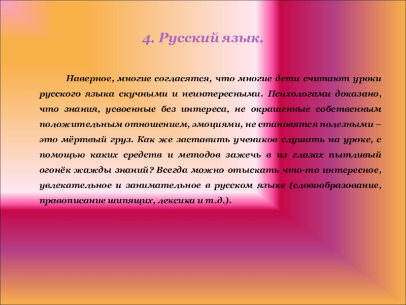 согласятся, что многие дети считают уроки русского языка скучными и неинтересными. Психологами доказано, что знания, усвоенные без интереса, не окрашенные собственным положительным отношением, эмоциями, не становятся полезными – это мёртвый груз. Как же заставить учеников слушать на уроке, с помощью каких средств и методов зажечь в из глазах пытливый огонёк жажды знаний? Всегда можно отыскать что-то интересное, увлекательное и занимательное в русском языке (словообразование, правописание шипящих, лексика и т.д.).