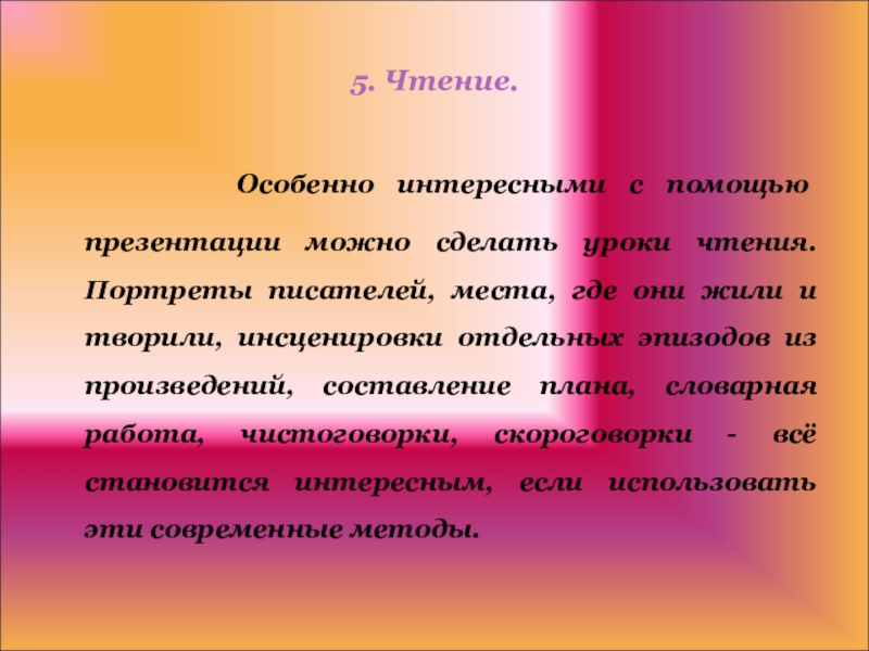 уроки чтения. Портреты писателей, места, где они жили и творили, инсценировки отдельных эпизодов из произведений, составление плана, словарная работа, чистоговорки, скороговорки - всё становится интересным, если использовать эти современные методы.
