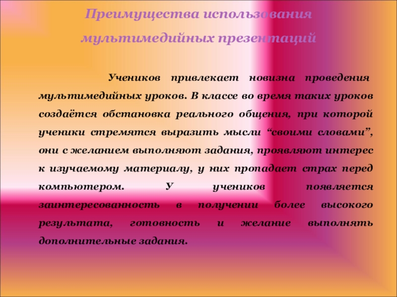 новизна проведения мультимедийных уроков. В классе во время таких уроков создаётся обстановка реального общения, при которой ученики стремятся выразить мысли “своими словами”, они с желанием выполняют задания, проявляют интерес к изучаемому материалу, у них пропадает страх перед компьютером. У учеников появляется заинтересованность в получении более высокого результата, готовность и желание выполнять дополнительные задания.