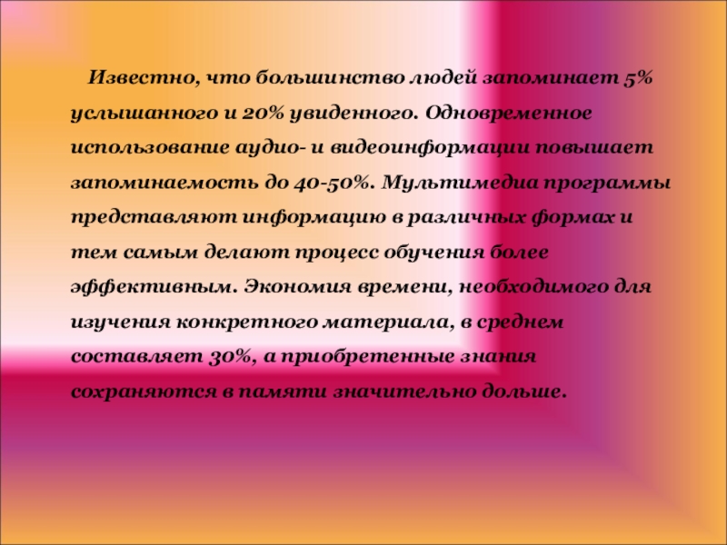 услышанного и 20% увиденного. Одновременное использование аудио- и видеоинформации повышает запоминаемость до 40-50%. Мультимедиа программы представляют информацию в различных формах и тем самым делают процесс обучения более эффективным. Экономия времени, необходимого для изучения конкретного материала, в среднем составляет 30%, а приобретенные знания сохраняются в памяти значительно дольше.