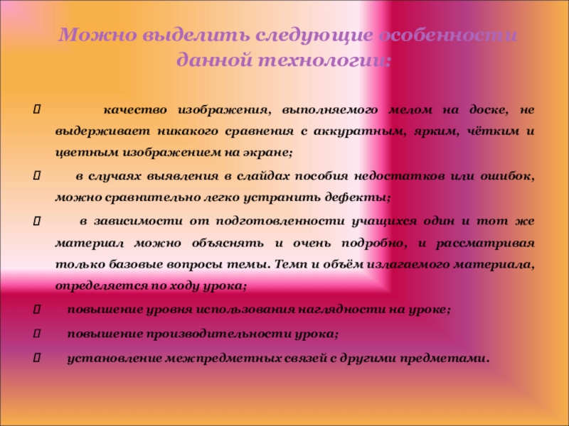 изображения, выполняемого мелом на доске, не выдерживает никакого сравнения с аккуратным, ярким, чётким и цветным изображением на экране;
