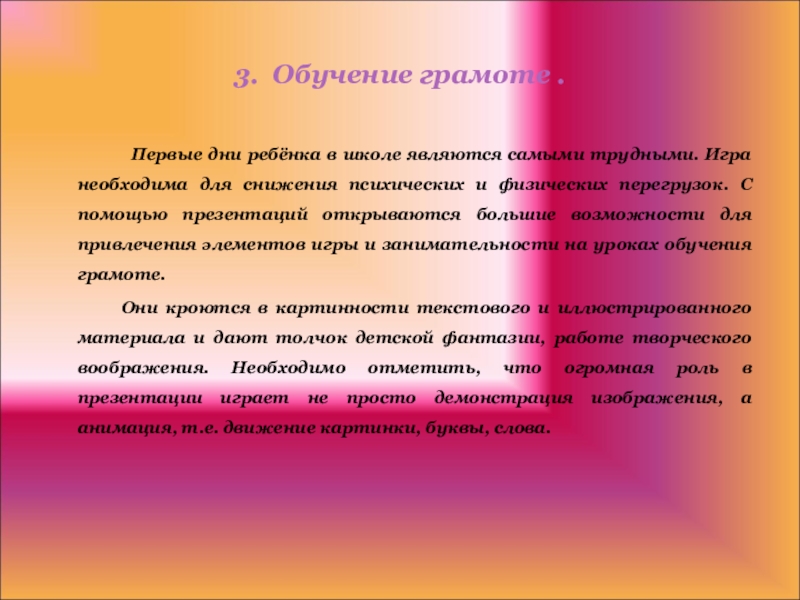 Они кроются в картинности текстового и иллюстрированного материала и дают толчок детской фантазии, работе творческого воображения. Необходимо отметить, что огромная роль в презентации играет не просто демонстрация изображения, а анимация, т.е. движение картинки, буквы, слова.